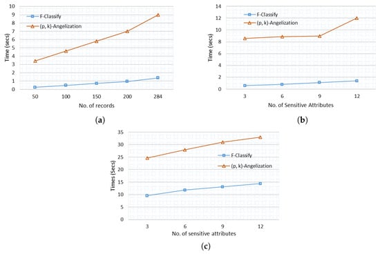 Variable numbers of records and sensitive attributes are used to compare execution time. The execution time increases as the number of records increases. While the execution time for F-Classify increases slightly as the number of records increases, the execution time for (p, k) angelization increases rapidly as the number of records grows, as illustrated in Figure 7a. When contrast to F-classify, which classifies SAs using an AI algorithm, (p, k) angelization takes longer to execute since it employs a weight calculation technique for each SA. F-Classify has a slight variation in execution time with the increasing number of SAs shown in Figure 7b. The execution time of an adult data set with 40,000 records is presented in Figure 7c, and the pattern is the same: as the number of SAs increases, so does the execution time. In both small and large data sets, (p, k) angelization takes longer to execute than F-Classify.