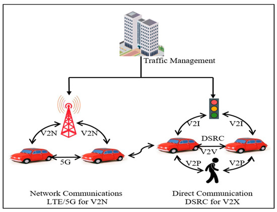 is a special type of Mobile ad hoc Network () where vehicles/devices act mobile devices, and their mobility is defined by network road topologies [1]. The goal of is to assist drivers and subscribers with a reliable and safe atmosphere. The communication in takes place from Vehicle to Infrastructure (), Vehicle to Vehicle (), and Vehicle to Everything which is a combination of both. Each vehicle is equipped with sensors such as onboard unit (), Bluetooth, 3G/4G/5G, and Wi-Fi that has communication and computational capabilities [2] (Table 1). Roadside unit () with dedicated short-range communication () [3,4] is the public infrastructure that is fixed on the roadside to provide internet to the vehicle [5,6]. A typical communication is shown in Figure 1. is a dedicated short-range communication, which is a one-way or two-way short-range to medium-range wireless communication technology based on the protocol [7,8]. In October 1999, the United States Federal Communications Commission allocated 75 MHz of spectrum in the 5.9 GHz frequency band for use by Intelligent Transportation Systems [9], which is now one of the two technologies that implement [10].