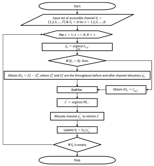 It can be noticed from Equation (2), is reduced with each repetition of the assignment, where and are the throughputs before and after channel, is the total number of channels in the network, and if increases, then tends to zero. However, given this situation, the recommended is defined in flow diagram 1 as shown in Figure 3. First, we initialize the set available channel for all vehicles, then for all vehicles do allocate the best available channel to the vehicle (a channel with maximum likelihood). Then, check if the set of channels assigned to the vehicle is not equal to zero. If it is not equal to zero, then, obtain throughput gain before and after channel allocation. If it is equal to zero, then, the likelihood of throughput gain is assigned. Assign each vehicle maximum throughput, and then, allocate channel with maximum throughput to vehicles. Update the allocated channel information with maximum throughout to each vehicle. If the allocated channel is empty, then, terminate, or else go to step 2.