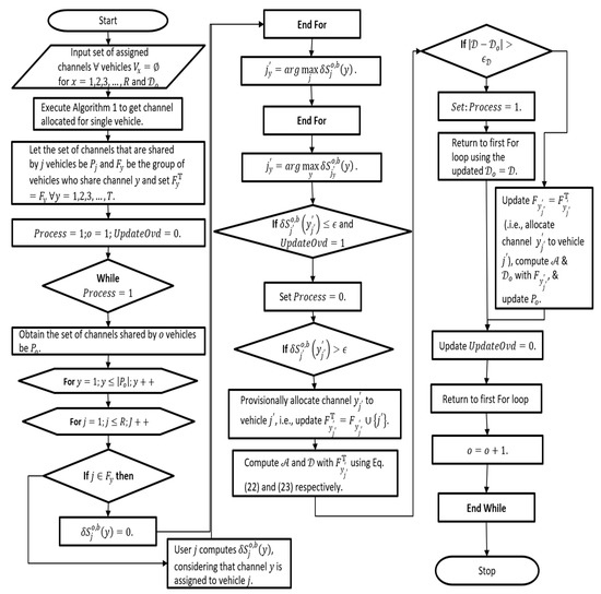 The channel allocation model includes two steps. In the first as shown in Figure 2, single-vehicle channel assignment information is computed using flowchart 1. The following deals with multi-user channel allocation by assigning channels assigned to specific vehicles to other vehicles. Here, we model the algorithm as shown in flow chart 2 in Figure 4.