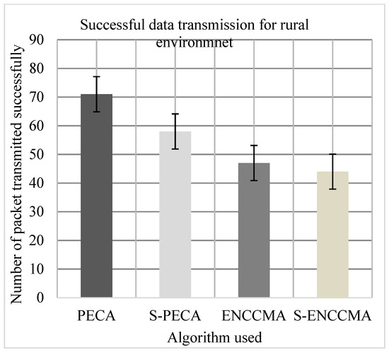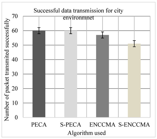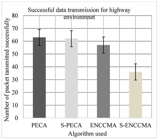 Experiments were conducted to evaluate the packet transfer of the proposed method compared to the existing method, and the overhead of security configuration was also evaluated. First, the experiment evaluated the successful transmission of and using 20 vehicles in the various environments as we can see in Figure 13, Figure 14 and Figure 15, respectively. The experimental outcome shows that performed a successful transmission of packets by 5.0%, 9.52%, and 33.8%, respectively, compared to in city, highway, and rural environments. The average improvement of the successful transmission is 21.66% achieved by compared to considering varied environmental models. Secondly, the experiment was conducted to perform the packet transfer performance of and considering 20 vehicles for C.H.R environments as shown in Figure 13, Figure 14 and Figure 15, respectively, considering security scheme. The experimental outcome shows that improves successful packet transmission by 15.0%, 41.93%, and 24.13% over in city, highway, and rural environments. The average improvement of successful transmission is 27.02% achieved by compared with considering varied environmental models. The overall result show that when a security scheme is added to and the model incurs an average successful packet transmission overhead of 6.63% and 17.97%, respectively, when provisioning security considering varied environment model. However, we can see the proposed model performed much better than the existing significantly in terms of successful transmission performance when provisioning security to it.