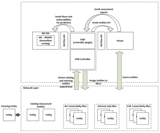As briefly described in the previous subsections, the first use case involves the identification of vulnerabilities on entities and the proactive measures to protect the system from possible implications imposed by vulnerable entities, which is a rather straightforward procedure. The Logic component, since it is developed as an SDN controller application, detects newly introduced entities in real-time. Thus, upon detection, it probes the VAaaS component with the discovered entities’ IPs to initiate a vulnerability assessment on each one of them. Consequently, the VAaaS component performs the assessments, a somewhat time-consuming procedure, produces detailed reports, and sends them back to the Logic component. These reports contain a list of the discovered vulnerabilities on each entity, and the overall score of the assessment, which is based on the standardized CVSS V3.0 score and classifies the entity into one of the specified risk levels: “Critical” (9.0–10), “High” (7.0–8.9), “Medium” (4.0–6.9), and “Low” (0.1–3.9). Consequently, the Logic component receives the reports and depending on the assessment results (CVSS V3.0 score), assigns each entity to a connectivity appropriate network slice, by applying the appropriate flow-rules on the SDN controller. Three self-explanatory network slices have been developed, slice#1, no-connectivity, slice#2, internet-only, and slice#3, full-connectivity. As one can infer, the ML-IDS component does not partake in this use case. A conceptual representation of the use case is depicted in Figure 2.