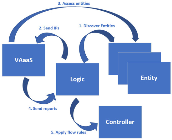 The logic component is an over-the-top SDN controller application that facilitates the overall functionalities of the presented framework. Inherently, the logic component is aware of its underlying network topology, in real-time. It instructs the VAaaS component to perform vulnerability assessments on newly introduced entities upon discovery (discovery is performed in real-time). Moreover, previously assessed entities are periodically reassessed in a preconfigured ad hoc manner. Based on the risk level that derives from the vulnerability assessment report (CVSS score), each entity is assigned to a connectivity-appropriate network slice. There are three distinct network slices that represent the entities’ risk-levels. Namely, the “full connectivity” slice, for low risk level (CVSS between 0.1–3.9), the “internet-only” slice for medium risk level (CVSS between 4.0–6.9), and “no-connectivity” slice for high and critical risk level CVSS between 7.0–10.0). Thus, entities with high-risk levels (CVSS score above 7.0 [38]), posing a potential threat to the network, will not be granted network access. The slicing is dynamically enforced by applying all the necessary flow-rules for the target entity on the SDN controller, by the logic component.