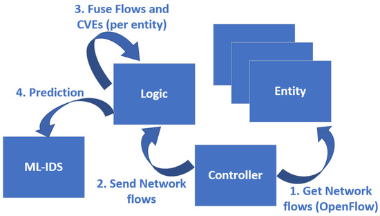 Moreover, the logic component also facilitates the fusion and propagation of the appropriate data to the ML-IDS. In more detail, it collects the NetFlow data from the entities, fuses them with the discovered vulnerabilities, if any, for each entity, and sends them to the ML-IDS. In this way, the ML-IDS can perform its prediction. More structured details concerning the functionalities of the component will be presented in the following subsections.