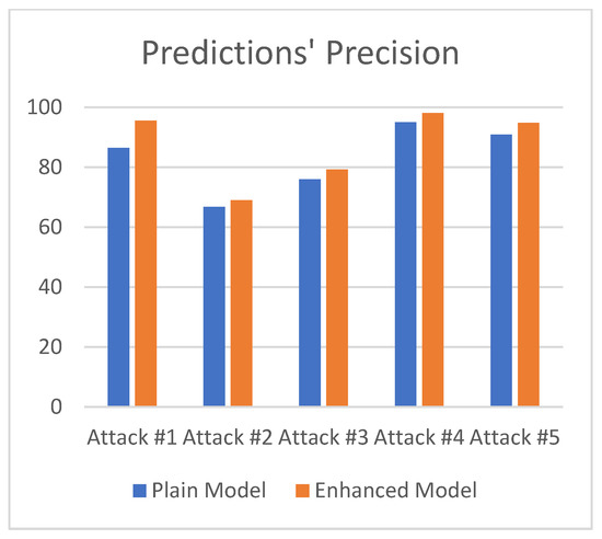 Results signify that the enhanced model produces higher prediction accuracy results on all of the attacks. The mean precision for the plain model is ~83%, and for the enhanced model it is ~87%. The enhanced model demonstrates an increased precision of more than 4%. The graphical comparison of the two models is depicted in Figure 4.