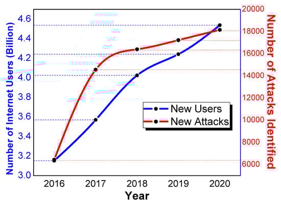 There are billions of users who are connected through thousands of autonomous systems over the Internet globally. The world has witnessed the exponential growth of Internet traffic for many years. This massive upsurge in the network traffic contains data from many sources, which are diverse in nature. Notably, this data may bring different types of anomalies, which can affect network security [1]. It can be observed in Figure 1, which is plotted based on the data of Skybox Security [2] and Redscam Report [3], that the Internet users and network attacks are growing at the same pace. According to the graph, more than 18,000 new attacks were detected in 2020, which is 5.13% more than the previous year.