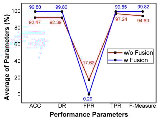 Figure 3 depicts the average outcomes of each parameter with and without fusion. As previously mentioned, the UNSW-NB15 is kept in X which results in all the tuples of X and common tuples of X and Y during left-join process. Therefore, we select UNSW-NB15 dataset for comparison to ensure the proof of concept for data fusion. The x-axis shows the parameters, whereas the y-axis shows the percentage value against each parameter. In addition, the red line represents the average values without fusion and the average values with fusion are presented in the blue line. The ACC, DR, TPR, and F-Measure in each experiment are more than 99% and the averages of ACC, DR, TPR, and F-Measure of all experiments with fusion are 99.80%, 99.80%, 99.85% and, 99.82%, respectively. The FPR in each experiment is less than 0.45% and the mean value of FPR is 0.29%, which indicates the less false alarm rate. In contrast, the same parameters show less performance without fusion, which clearly shows the effectiveness of MIND. It can be concluded, from the results, that the feature level fusion among two datasets and pipelining technique for model building can be a significant reason for better results of MIND.