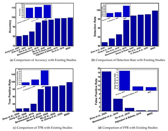 The comparison of FPR is shown in Figure 5d and is only discussed by four studies which include Zhao et al. [16], Benmessahel et al. [22], Gu et al. [20], and Hajisalem et al. [24]. There is a clear difference between existing studies except Hajisalem et al. [24] and MIND. In order to provide a comparison with this study, we have shown a magnified sub-graph where it can be observed that the FPR of the proposed approach is less than 0.3%. However, the FPR is 0.4% in [24]. It is worth mentioning here that all the existing studies do not focus on all the parameters. Therefore, we present a comparison of the individual parameter of each study.