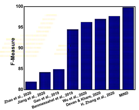 The comparison of F-Measure is presented in Figure 6, where the proposed approach is compared with several studies that include Zhao et al. [16], Jiang et al. [19], Gao et al. [21], Benmessahel et al. [22], Devan et al. [17], Wu et al. [18], and Zhang et al. [15]. It can be observed that the F-Measure of the proposed approach is more than 99% and outperforms existing literature. Conclusively, the ACC, DR, TPR, FPR, and F1-Measure parameters of the MIND outperform other studies by intelligently applying the model classifier on the fused dataset.