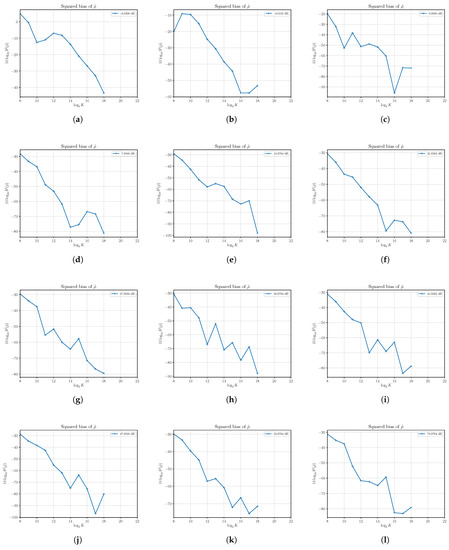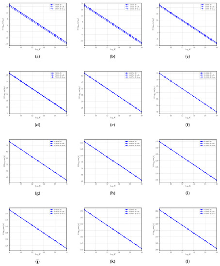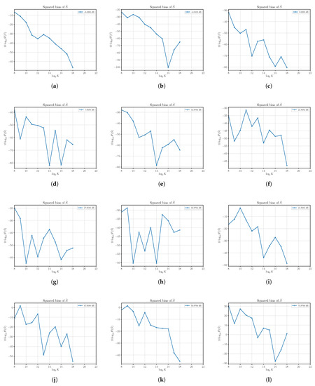 The estimated squared bias of the SNR estimator versus the number of observations K. Each sub figure (a–l) shows results for a given nominal value of SNR obtained by changing the signal power S and with noise power .