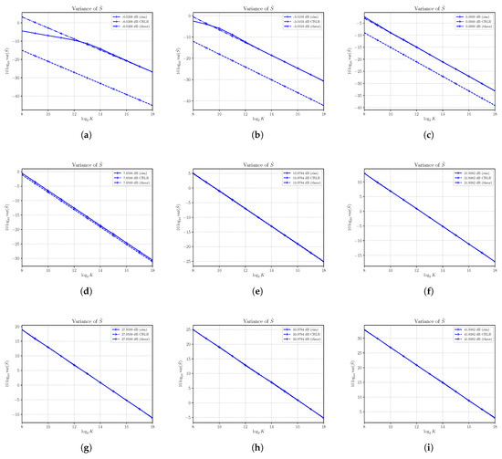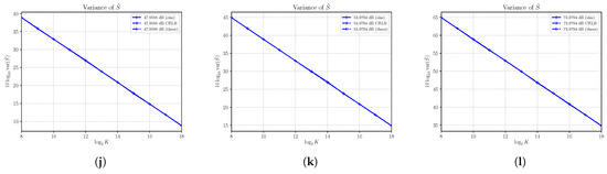 The sample moment estimator is, under first order approximation, unbiased. The performances in terms of variance of are shown in Figure 2, where estimated variance, CRLB and asymptotic variance are shown at different SNRs obtained by varying S with . In all cases under consideration, the estimated variance and the asymptotic variance are superimposed even for a small numbers of observation K, confirming, also in this case, the validity and usefulness of the asymptotic analysis carried out above. While in all cases the sample estimator results are consistent, we see that at low SNRs, the estimator can be regarded as nearly efficient because the variance of is not superimposed on the CRLB, though it is very close (as shown, for example, in Figure 2a–f). Note that the variance of the estimator increases to significantly large values as the SNR becomes larger by increasing the power S.