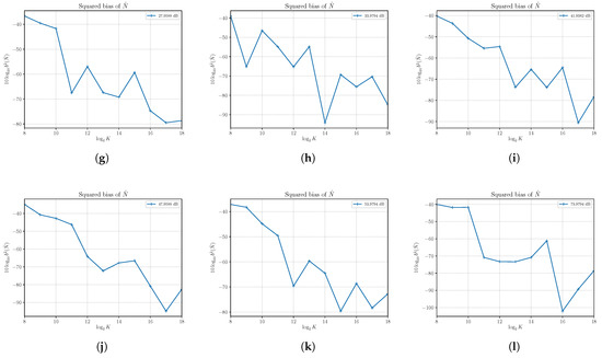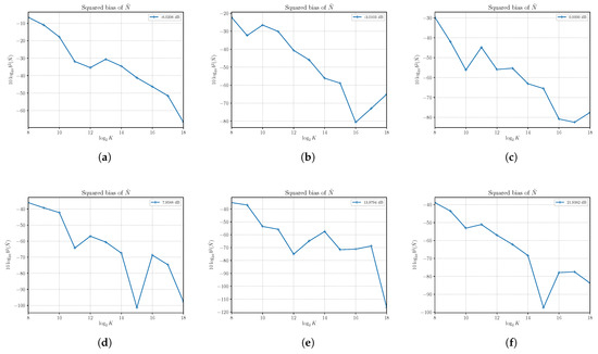In Figure 3, we report the results of the estimation of the squared bias of at different SNRs obtained by setting and varying S. We see that in all reported cases, the squared bias is sufficiently small even for a small number of observed samples K, and then we find that is practically (asymptotically) unbiased.