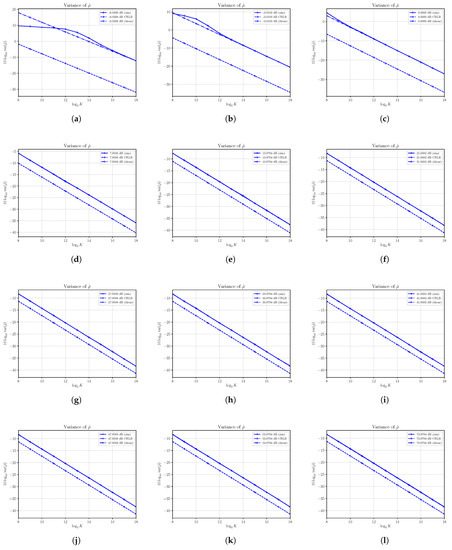 Estimates of the variance of are shown in Figure 4 together with the corresponding asymptotic variances and CRLBs. First, the results confirm the derivation of the asymptotic performances obtained in Section 3. Though valid only for , it is interesting to note that the asymptotic results are achieved also for a small number of samples in most of the cases under consideration. In all cases, with , the variance of is well approximated by the asymptotic variance that shows that the estimator is consistent. It is not always efficient, especially at a relatively small SNR. Consider, for example, Figure 4a, which shows the variance for and , corresponding to the SNR equal to −6.0206 dB. The asymptotic variance, which is achieved by the estimator with at least samples, cannot achieve the corresponding CRLB. This is also true in Figure 4b,c. On the other hand, starting from Figure 4d, we see that the asymptotic variance is superimposed to the corresponding CRLB, and then the estimator becomes efficient. For a sufficiently large SNR, the asymptotic variance is able to predict the effective variance of the estimator even for a very small number of samples K.