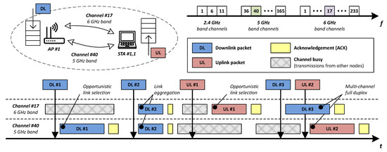 In general, multi-link operation aims to (1) improve throughput by aggregating links [23], (2) enhance reliability by transmitting multiple copies of the same frame in separated links, (3) decrease channel access delay by selecting the first available link in terms of latency [24], and (4) enable isolation of time-sensitive traffic from other network traffic [25]. In short, having two active links operating at different bands/channels between an AP and an STA may increase channel access efficiency by enabling opportunistic link selection, link aggregation, and multi-channel full duplex [26]. Figure 1 shows several of the previously mentioned cases: opportunistic link selection, link aggregation, and multi-channel full duplex.