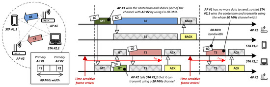 In Figure 4, two different frames originated in the same BSS (a best-effort one from AP #1 and a time-sensitive one from STA #2,1) are simultaneously transmitted by splitting the total 80 MHz spectrum bandwidth into two non-overlapping channels of 60 MHz and 20 MHz, respectively. To make this coordination possible, once AP #1 wins the contention, it signals the RU allocation information by means of a multi-AP trigger. In turn, AP #2 notifies STA #2,1 of its corresponding RUs with a basic trigger.