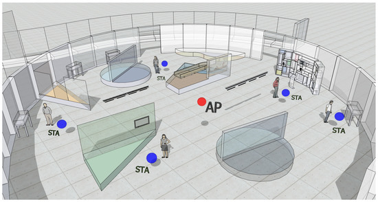 Let us consider a circular hall of radius m containing an interactive exhibit with a single AP placed in the center, as shown in Figure 7. (Image based on the Google SketchUp model of the Museum Mysteries exhibit of the Waterloo Region Museum located in Kitchener, Canada (https://3dwarehouse.sketchup.com/model/ufac3aabd-f3c2-4caa-b775-785217b2e9e8/Museum-Mysteries-Exhibit, accessed on 20 July 2021)). Users are placed uniformly at random on the museum’s hall. The AP provides visitors in that hall with a set of customized interactive services by means of DL unicast transmissions that can be categorized according to their priority level:
