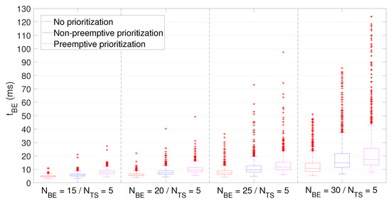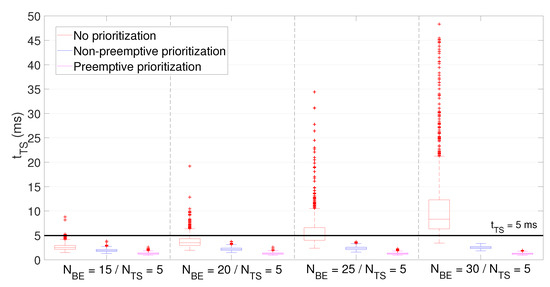 If we observe the latency of BE packets, it grows in all three policies when increasing , attaining the preemptive prioritization policy the highest values but with a median contained below 20 ms. Moreover, although outliers achieve up to 125 ms in some concrete cases, they are always below 150 ms. As for latency of TS packets, its value grows in line with when using the no prioritization policy, unable to meet the stated requirement (i.e., < 5 ms) on average for more than users.