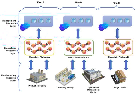 In addition to what has been said, the blockchain represents a useful technology for securely storing information relating to intangible procedures, e.g., when a checkup of an industrial tool was conducted simultaneously with operational data such as peak measured vibrations. Therefore, a key objective for Industry 4.0 smart factories is to allow rapid reactions to the feedback received from the various members of the value chain. Another aspect of Industry 4.0 concerns the integration of different technologies. In this regard, the blockchain can become an information exchange hub. The various users, independent of the technology used, only need to implement the most appropriate blockchain client functionality. Figure 1 schematically illustrates the application of blockchain in the industry. A given industrial process is split among various firms, each devoted to a specific phase and offering the resources for composing the manufacturing process. The recent view of cloud manufacturing [] consists in integrating all users and all workflows, avoiding waste and unproductive losses along the entire value chain, multiplying the possibilities of negotiating and managing contracts. Specifically, it realizes the outsourcing of systems, infrastructures, and services whose IT components (system hosting, maintenance, updates, and security supervision) instead of being managed directly by the company are entrusted to a trusted provider that provides the service in on-demand and pay-per-use. Nowadays, manufacturing companies are typically large, with factories and warehouses distributed in different geographic locations with national and international supply and subcontracting relationships. Networked manufacturing uses middleware for the integration of these distributed resources. The main limitation of such an architecture is to have the overall production process segmented in portions that communicate among each other with the middleware but lacks a way to provide a global view of the overall process. With cloud manufacturing, it is possible to follow the entire production process, from the design phase to the realization of the product, up to its maintenance. However, such a vision implies a centralized (in the cloud) control of processes, despite nowadays in manufacturing witnessing ecosystems of companies rather than a single big player with many subsidiaries. Blockchains integrated with cloud manufacturing can cope with this limit as presented in []: each firm uses a node of a blockchain solution to get data and send commands towards the interconnected production resources, and up to the cloud-hosted management applications that the administrators of the firm use. Such an example makes it clear that the shipping facility needs data from the production facility to plan the logistics. In contrast, the design center needs to send the details to produce products to the production site, and so on.