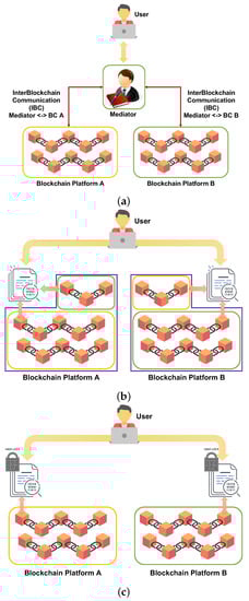 The current literature of the interoperability solutions is not only limited by the inter-ledger communication protocols [] to allow the communication from one blockchain to another but also includes software products to satisfy some of the previous definitions. Therefore, they can be grouped within three types of architectures [,]. The first type employs a centralized approach by having Notary schemes, as shown in Figure 2a. Specifically, these solutions have a central trusted component that mediates between interacting blockchain platforms and controls that the asset fetched from one blockchain is correctly added to the state of the other blockchain. Such a design is simple and verifies the consistent asset transfer despite possible failures and attacks. An example of this kind of solution is represented by Hyperledger Cactus [], which is designed around a routing API and business logic interface to route requests across multiple blockchains and validator nodes to offer proofs of the state changes due to cross-chain transactions.