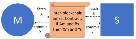 The inter-blockchain smart contract approach briefly sketched in Figure 3 has the primary characteristic of not requiring the deployment of a centralized solution based on a notary scheme. Instead, its approach is to split the logic of interoperable smart contracts into two parts, one interacting with a blockchain and the other one with another interoperable blockchain, like what happens in the case of two-way relays. Moreover, we have discarded the possibility of using a sidechain, with the primary goal of avoiding memory occupation and time consumption to keep such a chain consistent with the main chain. Furthermore, we have assessed hash locking schemes as not being suitable due to their limited applicability in the target scenario []. Hash locks are mechanisms applied to cryptocurrencies to reserve transactions on one ledger until the second ledger produces the cryptographic proof based on the correct execution of an atomic swap. This is needed so that both ledgers have a consistent state due to the inter-blockchain smart contract execution. However, current solutions for hash locking have not been used outside the context of cryptocurrencies, such as token portability or cross-chain oracles. Specifically, the physical objects are represented within a blockchain utilizing tokens whose format is platform-specific and hard to exchange among platforms due to the representation heterogeneity. A cross-chain oracle is a smart contract running at one ledger, reading from a smart contract on another ledger, and performing an action based on the received read result.