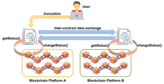 Blockchain technology has been implemented in multiple manners, fostering the spread of heterogeneous platforms and solutions that do not interoperate with each other. While it is generally recognized that blockchain interoperability is strongly needed, the concept of blockchain interoperability is not well defined in the current literature. As an actual example, in [] two blockchain solutions are assumed interoperable if there exists a transaction in a block accepted by the consensus algorithms running at both solutions and considering their states. However, the authors have proved that such a definition is not feasible and introduced a weaker definition where the consensus algorithms consider the joint state of both blockchains. In [], blockchain interoperability implies secure state transitions across different blockchains by running cross-chain decentralized applications. The work in [] proposes a different definition where interoperability is achieved when native cryptocurrencies can be exchanged among two or more heterogeneous blockchain platforms. In [], blockchains can interoperate if they can mutually exchange information among them in a unified manner. Last, in [], interoperability is identified not only between smart contracts or data exchange between heterogeneous solutions (i.e., inter-blockchain interoperability) but also within the same distributed ledger where smart contracts designed by different designers and organizations can interact with each other (i.e., intra-blockchain interoperability). Definitely, interoperability does not mean that a given smart contract formalism and programming language used in one platform can also be executed in another one. Therefore, as an example, the deployment of Ethereum Smart contracts written in Solidity on Hyperledger Fabric through the EVM chaincode (EVMCC) and Fab3 [] is not an example of blockchain interoperability.