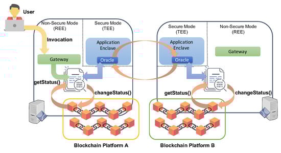 Figure 5 schematically illustrates the proposed solution. A gateway is a software application receiving requests from the user, and based on them, invokes a given smart contract deployed on the hosted blockchain platform. Suppose the invoked smart contract imposes a transfer of an asset towards another blockchain. In that case, the smart contract interacts with the oracle service hosted in the secure zone of the TEE, which establishes a TLS connection with its counterpart at the companion node. The latter receives the request, checks the current state of the blockchain, and performs an update if the request action is doable considering the fetched blockchain state. Finally, the outcome is returned to the oracle, which replies to the smart contract in charge of appropriately updating the first blockchain state.