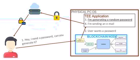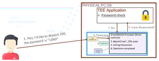 Before inserting any transaction, a user should contact the TEE to obtain a password, as, without a password, it is not possible to perform any transaction on the distributed ledger. To this purpose, as Figure 6 shows, the gateway forwards the received command to the local TEE through a protected and ciphered channel established with TLS. The latter generates a random password and sends it to the user’s email as an encrypted authentication token (similarly to what happens in the JSON Web Tokens []) through a third-party HTTPS web service. With the received password, the user can perform transactions on the ledger or even between two or more ledgers by invoking smart contracts and using the gateway. In addition, the gateway forwards the received password to the local TEE, which compares it with the previously generated one and reports back the authentication decision, as Figure 7 illustrates.