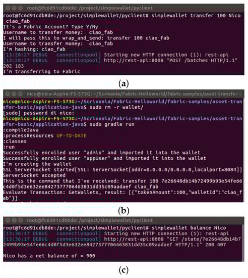 Interoperability unit test: (a) Transferring from a Sawtooth wallet to a Fabric one, (b) Receiving the transfer request on Fabric, (c) Checking the origin wallet after the transfer.