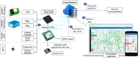 Based on the related works, the essential element to integrate a gas sensor into the hardware system is the type of sensor selection and targeted gas [,,,,]. CO2 was found to be the most critical pollutant in the vehicle cabin with the RC ventilation mode. Moreover, the CO2 concentration is affected by the speed of the vehicle [,]. Thus, an integrated in-vehicle air quality monitoring system was developed for this work. The developed system has an integrated GPS tracking device as well as a CO2 gas sensor. Additional sensors such as particulate matter, temperature, and humidity are also embedded into the system. The overall system architecture of the in-vehicle air quality is illustrated in Figure 1. The system design is separated into four parts which are hardware development (device node), cloud database, software development (user interface), and an in-vehicle air quality prediction model. An IoT-oriented transportation system is applied in this system by connecting the device node to the internet in order to push real-time data into the cloud database [].