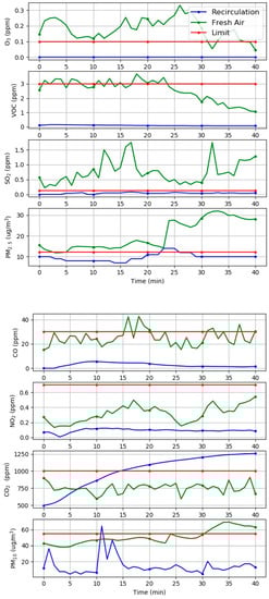 Figure 3 shows the data collection of the common hazardous gases inside the vehicle cabin with the FA mode. For the FA mode, the quality of air inside the vehicle cabin is highly dependent on the outdoor air quality. Results show that most of the parameters observed exceeded the recommended limit established by the DOSH standard. Only two parameters—CO2 and SO2—are below the recommended limit. In the FA mode, the CO2 gas detected in the vehicle cabin was in the range of 600–900 ppm and the data collection showed a similar range with the outdoor air. It can be assumed that the low SO2 obtained is due to the experiment routes performed outside the petroleum refineries, chemical manufacturing industries, mineral ore processing plants, and power station areas. Meanwhile, the RC ventilation mode presented lesser hazardous gases existing inside the vehicle cabin. The only three parameters, which are CO2, PM2.5, and PM10 exceeded the recommended limit with reference to the DOSH standard. The air quality inside the vehicle cabin was not affected by the outdoor environment.