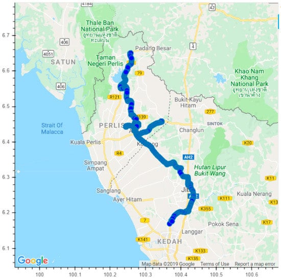 After finishing the preliminary experiment, we identified the essential observation parameters for further investigation. Next, the experiment is conducted on a real-time traffic basis. The experiment is performed for two months entirely under RC ventilation mode conditions. The travelling time can be separated into three slots, which are morning (06:00–08:00), afternoon (11:20–13:30), and evening (16:00–18:00). Travelling distance in June 2019 is 2306 km for 14 days, and July 2019 is 2494 km for 19 days. The daily average travelling distance is approximately 164.7 km, as shown in Figure 4. The minimum occupant is one and the maximum occupants are five. The experiment vehicle is a sedan car type with 2.75 m3 of space. Figure 5 shows the daily travelled path in this experiment. On the other hand, Table 2 shows the size of the data samples that have been collected throughout the experiments. Time series data in the air quality system has a parameter dedicated to counting the number of packets received by the cloud database. Each time the device is powered up, the count will be set as one and increases according to the subsequent data packet. Thus, the section data can be sorted using the count parameter. The average acquisition time for each data is 4 s. Once the data entered into the cloud database is completed, the vehicle speed is computed using the latitude, longitude, and time data. Then, the data labelling for the ML algorithms is generated. The data labelling is used to help the algorithms to train better and produce reliable results.