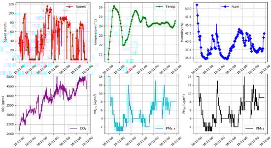 Figure 5 shows the raw CO2 sensor data on three different days for the morning slot. The fluctuation in the graph is due to the variation of the vehicle’s speed as well as the number of occupants in the car. The graph shows that the CO2 concentration level is higher than the recommended level by the Department of Occupational Safety and Health (DOSH). Other parameters of the morning slot such as vehicle speed, temperature, humidity, CO2, PM2.5, and PM10 are illustrated in Figure 6.