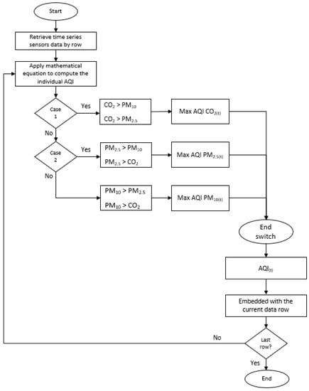 Figure 7 shows the flowchart of labeling the in-vehicle air quality index. The parameters of CO2, PM2.5, and PM10 are selected to compute the index for pollutants. The highest index represents the AQI at that time. A large pressure will be created against the vehicle’s body when the vehicle travels at a high speed and leakages will occur between the joints []. The higher the vehicle speed, the more outdoor air will be penetrating the vehicle cabin []. Thus, other parameters such as temperature, humidity, and vehicle speed may also affect the AQI inside the vehicle cabin.