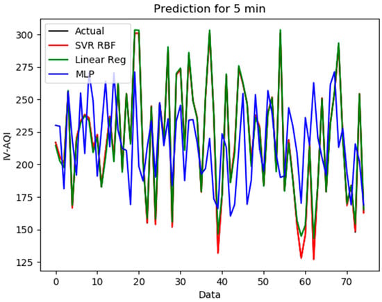 With respect to prediction systems, artificial intelligence algorithms are widely used in smart city applications for classification prediction and regression prediction such as human activity classification [,], transportation [], and air quality prediction [,,,]. In [] the authors applied the ML algorithms to predict the air quality by using the data from 750 observations with 0.95 accuracy and their prediction was successful. [] focused on predicting air pollution in Canada using an MLP, and the prediction model performed on PM2.5 had 4.5 of MAE.