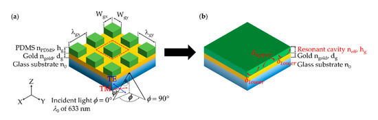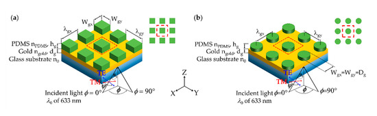 - Rectangular pillars made of PDMS with of 1.4283 [29] coated plasmonic gold sensor with thickness dg and refractive index of 0.18344 + 3.4332i [21] on a standard BK7 glass coverslip with the refractive index n0 of 1.52. The rectangular grating was on a rectangular grid with the grating height of hg, the grating periods along the x-axis and y-axis with the width of deposited PDMS along the x-axis and y-axis , respectively as shown in Figure 2a. The sensing region is on the top of the structure with the sample refractive index of ns. Grating fill factors along the x-axis FFx and the y-axis FFy are defined as Wgx/λgx and Wgy/λgy.