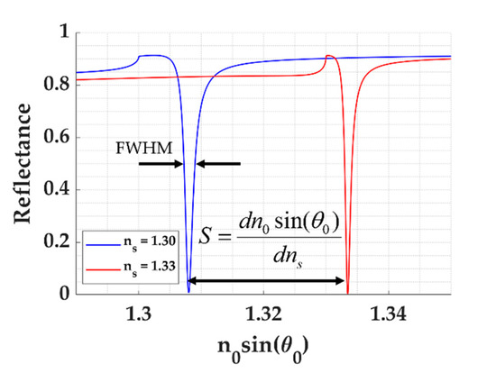 The full width at half maximum (FWHM) is defined as the width of reflectance dips at the intensity of 0.5, as depicted in Figure 3.
