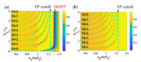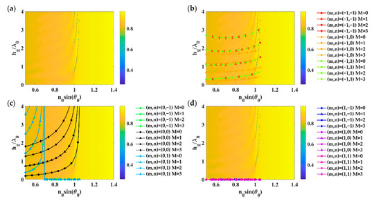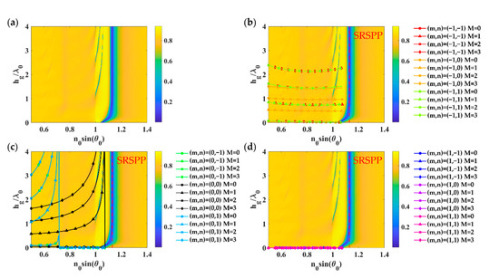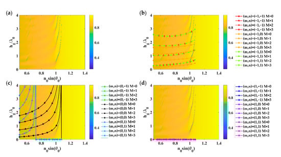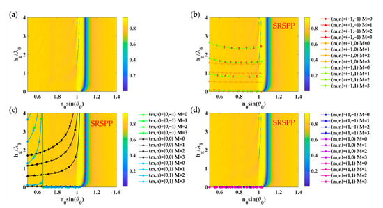Figure 6a shows optical reflectance calculated using RCWA for the 2D rectangular grating with FFx of 0.3, FFy of 0.5, λgx, and λgy of 1.25λ0 deposited on a uniform gold layer with the gold thickness dm of 48 nm when illuminated by linearly polarized TM wave at 633 nm wavelength. There are FP modes after the critical angle of 1. The first mode that appears at the lower grating height is the short-range surface plasmon polaritons (SRSPP) labeled as ‘SRSPP’ in Figure 6b,d. Figure 6b shows different grating diffracted orders from m of −1 and n of −1 to 1 for the FP mode numbers of 0 to 3 calculated using the effective refractive index model expressed in Equation (6) and the asymmetrical FP condition Equation (3). Figure 6c,d was calculated using the same method as Figure 6b; however, they were calculated for m of 0 and 1 instead. Thus, the FP modes in the 2D grating were excited by the m of 0 and n of 0 diffracted order.