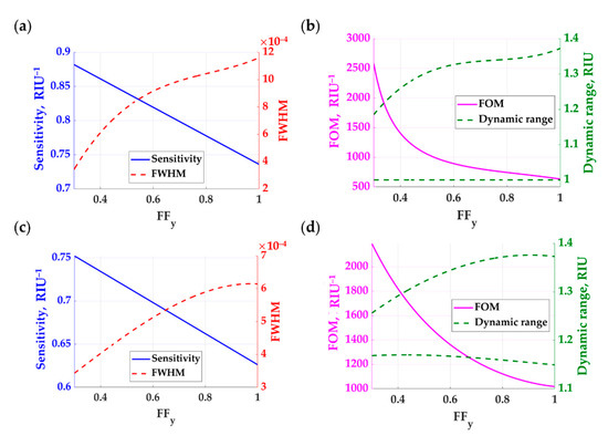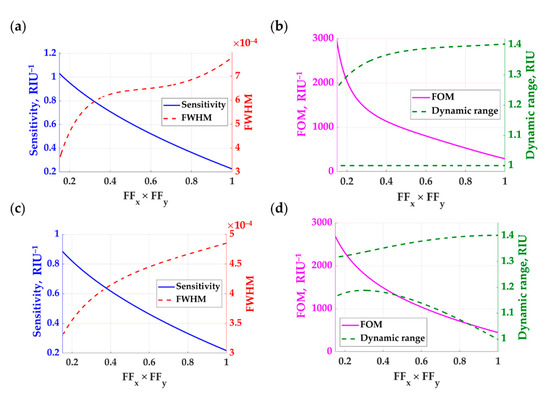 Sasivimolkul et al. [13] reported that the 1D grating with FFx of 0.3, hg of 900 nm, and λgx of 1.25λ0 is a practical sensor design, considering the fabrication feasibility and the proposed 1D grating does not show a strong mode hybridization. Hybridization between modes may obscure the continuity of FP dip movement, degrading the sensitivity and the detection range. Here, we have taken the 1D feature forward and remove the grating material along the y-axis, making a 2D grating structure by keeping the other parameters. Figure 10a–c shows the sensitivity in the blue curve and the FWHM in the red curve. The sensitivity is linearly proportional to the volume of the gap region available to the sample refractive index. The lowest possible FFy is at FFy of 0.3 before the FP mode cutoff occurs. It is pretty straightforward to predict that the sensitivity is enhanced by the amount of sample material inside the grating. However, this does not show how obvious the 2D features of the grating enhance the FWHM. There is nonlinear FWHM behavior depending on the FFy. The 2D rectangular grating can provide a narrower FP dip than the 1D grating case (FFy of 1), as shown in Figure 10b–d, leading to a 3.8 and 2.4 FOM enhancement factor for TM polarization and TE polarization, respectively. The FOM enhancement, however, comes with a tradeoff in the detection range. The detection range for the TE polarization was narrower than the TM polarization. Therefore, the TE polarization is not suitable for gas sensing, as shown in Figure 10d, whereas gratings with FFy more than 0.6 are suitable for biological sensing for the two polarizations, as shown in Figure 10b–d.