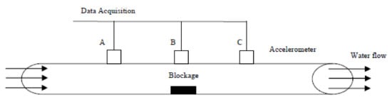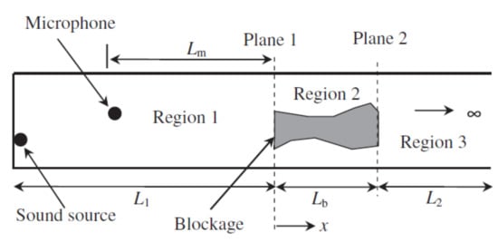 The placement of sound source and microphone in a pipeline for reflectometry test. Reprinted from Applied Acoustics, Volume 87, Duan, W.; Kirby, R.; Prisutova, J.; Horoshenkov, K.V. On the Use of Power Reflection Ratio and Phase Change to Determine the Geometry of a Blockage in a Pipe, Page 190–197, Year 2015 with permission from Elsevier [43].
