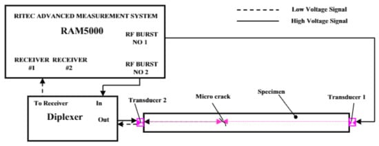 Schematic diagram of the experimental setup for collinear wave mixing. Reprinted from NDT & E International, Volume 62, Jiao, J.; Sun, J.; Song, G.; Wu, B.; He, C. Micro-crack Detection Using a Collinear Wave Mixing Technique, Page 122–129, Year 2014 with permission from Elsevier [54].