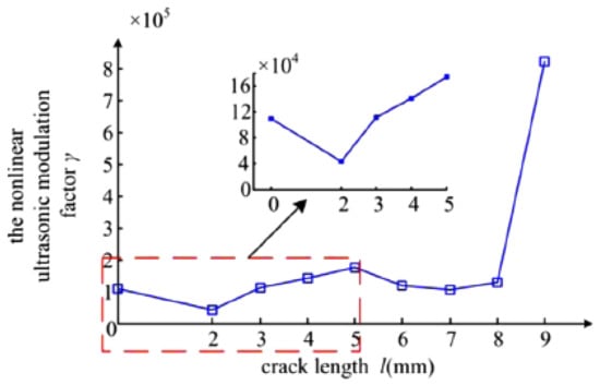 The relationship between the non-linear ultrasonic modulation factor and the crack length.Reprinted from NDT & E International, Volume 79, Li, N.; Sun, J.; Jiao, J.; Wu, B.; He, C. Quantitative Evaluation of Micro-cracks Using Non-linear Ultrasonic Modulation Method, Page 63–72, Year 2016 with permission from Elsevier [53].