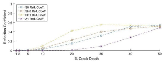 The predicted reflection coefficients of the S0, SH0, SH1 and A1 modes at varying crack depths on a 10 mm thick pipeline using the 2D finite element method. Reprinted under Creative Commons CC BY license [50].