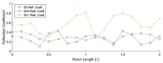 The predicted reflection coefficients of the S0, SH0 and SH1 modes at varying notch lengths and a fixed 30% notch depth on a 10 mm thick pipeline, using the 2D finite element method. Reprinted under Creative Commons CC BY license [50].