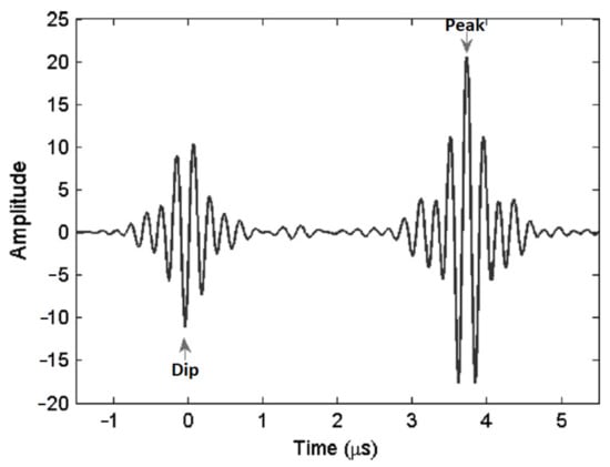 The dip and peak of pulses attributed to the front pipe wall and back pipe wall (designated by the arrows) which are 180 apart in phase. Reprinted from Ultrasonics, Volume 53, Honarvar, F.; Salehi, F.; Sasfavi, V.; Mokhtari, A.; Sinclair, A.N. Ultrasonic Monitoring of Erosion/Corrosion Thinning Rates in Industrial Piping Systems, Page 1251–1258, Year 2013 with permission from Elsevier [55].