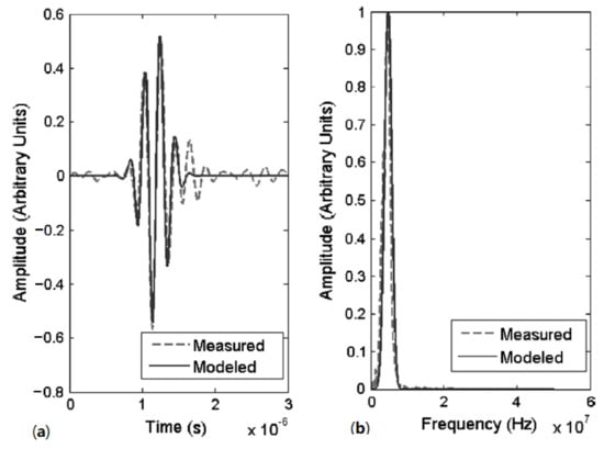 (a) The typical measured front wall echo and its corresponding Gaussian pulse. (b) The frequency spectra of the measured and modelled pulse. Reprinted from Ultrasonics, Volume 53, Honarvar, F.; Salehi, F.; Sasfavi, V.; Mokhtari, A.; Sinclair, A.N. Ultrasonic Monitoring of Erosion/Corrosion Thinning Rates in Industrial Piping Systems, Page 1251–1258, Year 2013 with permission from Elsevier [55].
