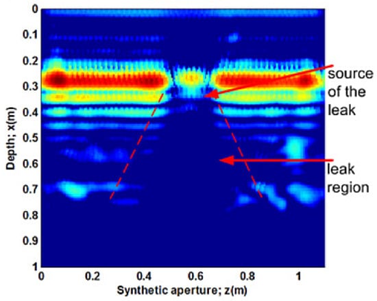 The GPR image of a leaking water pipeline. Reprinted from NDT & E International, Volume 47, Demirci, S.; Yigit, E.; Eskidemir, I.H.; Ozdemir, C. Ground Penetrating Radar Imaging of Water Leaks from Buried Pipes Based on Back-projection Method, Page 35–42, Year 2012 with permission from Elsevier [2].