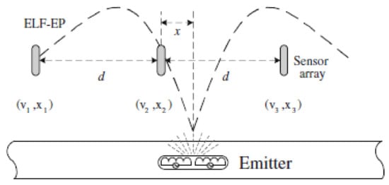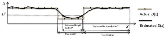 In [2], the distortion of the electromagnetic wave was measured in the form of a two-dimensional brightness scan (B-Scan). A series of overground B-Scans of the pipelines were put together and reconstructed using a back-projection algorithm to produce the image shown in Figure 13. A similar back projection approach was employed in [61] for the 3D image reconstruction of underground pipelines. The back-propagation algorithm proposed in [2] takes into account the compensation for the wave-front curvature effects, the effect of the finite bandwidth of the antenna and the refraction of the electromagnetic wave at the air–ground boundary. All these considerations improve the contrasts of the image pixels, which allows a clearer visualisation of the water loss events. The conventional back-projection method used in [2,61] employs Maxwell’s equations for the modelling of the electromagnetic wave propagation of the GPR. The inhomogeneous medium of propagation, such as varying soil densities and the abrupt change in the density at the soil–pipe interface, may result in the presence of uncertainties in the mathematical model. This concern is addressed in [62], using the Bayesian approximation error approach.