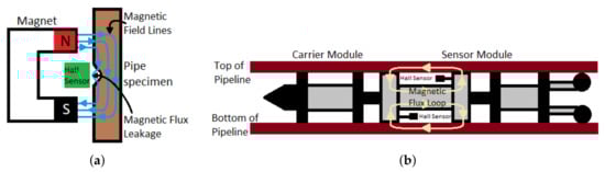 Human-operated inspection tools are often inefficient since intensive human participation is required in order to inspect relatively long distances of pipelines daily. Therefore, the employment of automated inspection tools has become increasingly popular. Prior to 2010, growing popularity in the use of ultrasonic-based inspection methods was observed, where research in the optimisation of the geometrical design of ultrasonic-phased arrays for guided wave inspection was actively conducted [6,7,8]. Since 2010, there has been a shift of interest from ultrasonic transducers to acoustic emission (AE) sensing methods [9,10,11]. There has also been a growing interest among researchers in inspection methods based on the analysis of hydraulic parameters such as pressure and flow rate [12,13,14]. At the same time, the employment of magnetic flux leakage (MFL) sensing for pipeline failure detection has become increasingly relevant due to its applicability across various types of pipeline failures [15,16,17].
