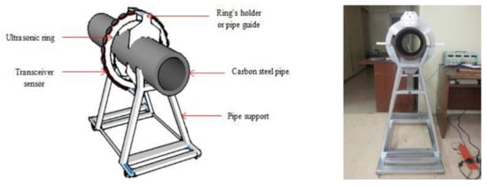 Ultrasonic waves are commonly used in guided wave inspection since ultrasound can be transmitted in a narrower beam, compared to that of audible sound, due to its significantly shorter wavelength. The narrow beam property allows ultrasound to be propagated more efficiently in thin solid media, such as the wall of a pipeline, for a distance of up to 50 m [48]. The wide-area scanning capability of ultrasonic waves can be significantly enhanced, using a guided wave transducer ring as shown in Figure 4. While the cost required to either acquire or build the ultrasonic transducer ring is still far from being economical due to the precision of the manufacturing aspects required, the cost of computation required to analyse the reflected signals captured by the ultrasonic transducer is also expensive, due to the high level of accuracy and resolution in signal processing needed. Often, a signal or spectrum analyser is used to overcome the computational needs.