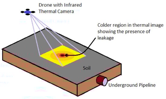 Technologies such as ground-penetrating radar (GPR) [2], infrared thermography [18] and impact echo (IE) [19] are widely employed in the industry, especially in human-operated inspection tools. However, the dimensions, designs and operational requirements of the sensing devices for these technologies have constrained them from being adopted in remote and automated pipeline monitoring systems [20]. In conjunction with the extensive implementation of Industry 4.0 [21,22,23], sensors, such as ultrasonic, acoustic, hydraulic and Hall effect sensors, have been retrofitted in the form of wireless sensor networks in existing pipeline networks [24,25,26]. These sensors are often small in size, inexpensive and can be easily interfaced with embedded systems. These technologies became increasingly relevant with the deployment of autonomous robots for the direct measurement of the magnitudes of defects in pipeline networks [27,28]. The emergence of unmanned aerial vehicles, better known as drones, for the detection of surface defects of pipelines has overcome the limitations of remote monitoring, at the same time reducing the workload required to monitor the integrity of pipelines in large plants [3].